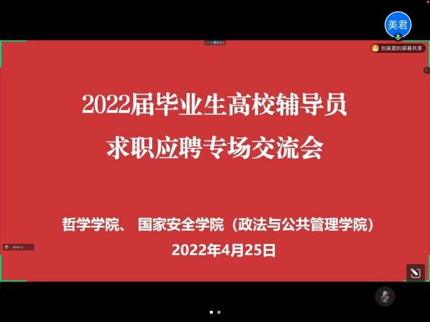 为扎实做好毕业生就业指导服务工作,落实分类施策方针,助力毕业生提升就业能力,实现高质量就业,2022年4月25日下午,jcjc5500公海贵宾会、国家安全学院(政法与公共管理学院)在文澜楼一层会议室联合举行2022届毕业生高校辅导员求职应聘专场交流会。交流会通过“线上+线下”相结合的方式进行,会议邀请已毕业优秀校友,现西北大学辅导员宁赐栋、西安电子科技大学辅导员刘越和我校jcjc5500公海贵宾会辅导员吴承恒、历史学院辅导员王致轩四位老师担任主讲。两学院研究生专兼职辅导员苏静、刘美君及2022届毕业研究生参加了此次交流会。会议由国家安全学院研究生辅导员苏静主持。