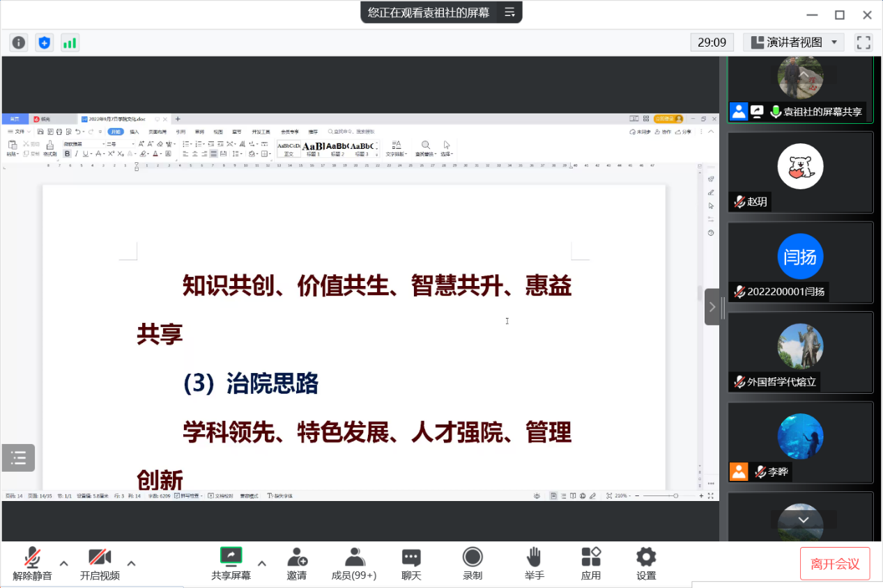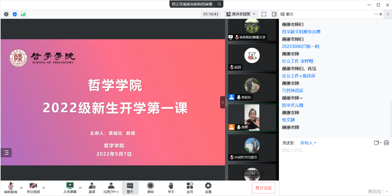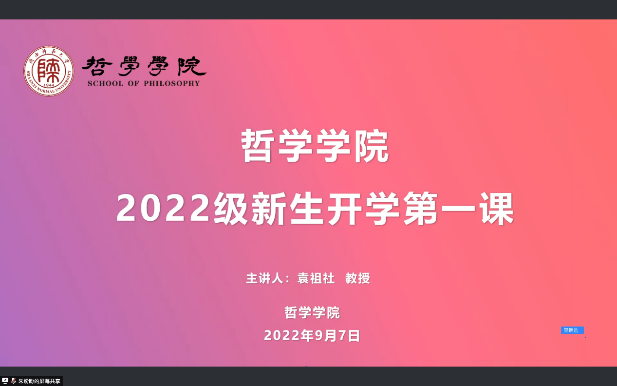 李晔在总结中感谢袁祖社教授的精心准备和精彩讲授,并表示,2022级新生作为新入院的哲院人,了解学院的历史、文化、院训、精神是非常必要的,同学们要了解、熟悉、融入哲学院这个大家庭,融入陕师大这片热土。今天,我们以哲学院为荣,哲学院未来的成长与发展将由同学们传承与续写。同学们纷纷表示,定将学院的精神内涵内化为自己的价值遵循,在新的学习阶段,与学院共同成长进步,共同开创崭新的、灿烂的明天!