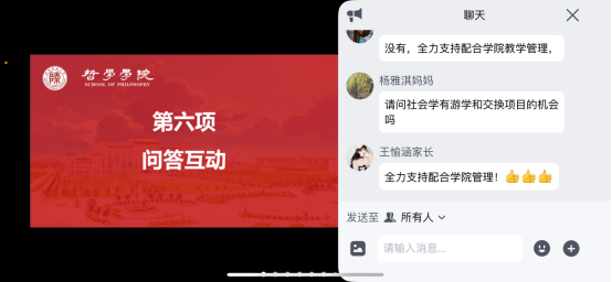 首先,石碧球向新生家长们介绍了我院的总体概况、本科人才培养体系、本科生就业情况、后续人才培养思路与举措。让家长们全面、系统地掌握学生的未来发展道路。其次,李晔向家长们介绍了新生入学情况、入学教育工作等事项。并提出了殷切期望,让家长们安心、放心。然后,王辉、李卫东分别就哲学系、社会学系的基本情况向家长们作以详述。让家长们对学生所学的专业及其中学习历程有了更细致的了解。再次,丁灵儿就辅导员工作和学校的重要制度向家长们传达。希望与家长们共同构建高效的沟通渠道。其后,学院领导与家长们交谈互动。就更详尽、具体的事宜答疑解惑。最后,刘冬对本次会议进行总结。围绕青年大学生、大学生活、家院联动三个关键词与家长们分享。