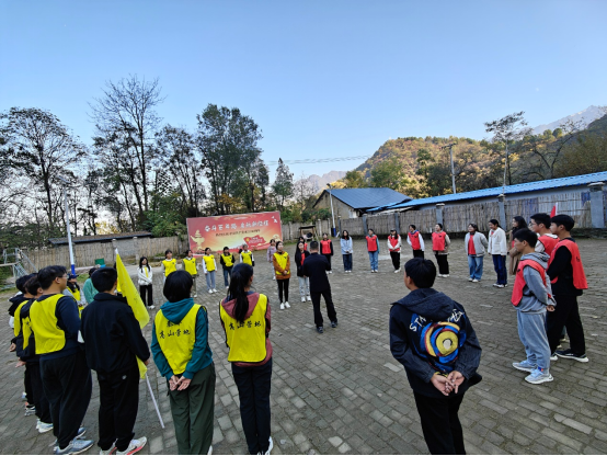 在教练的带领下,全体同学在山脚分成两个队伍并确立了队名、口号、队歌,并初步建立团队的架构。在旗手的带领下,同学们开始登山,一同前进到达训练营地。