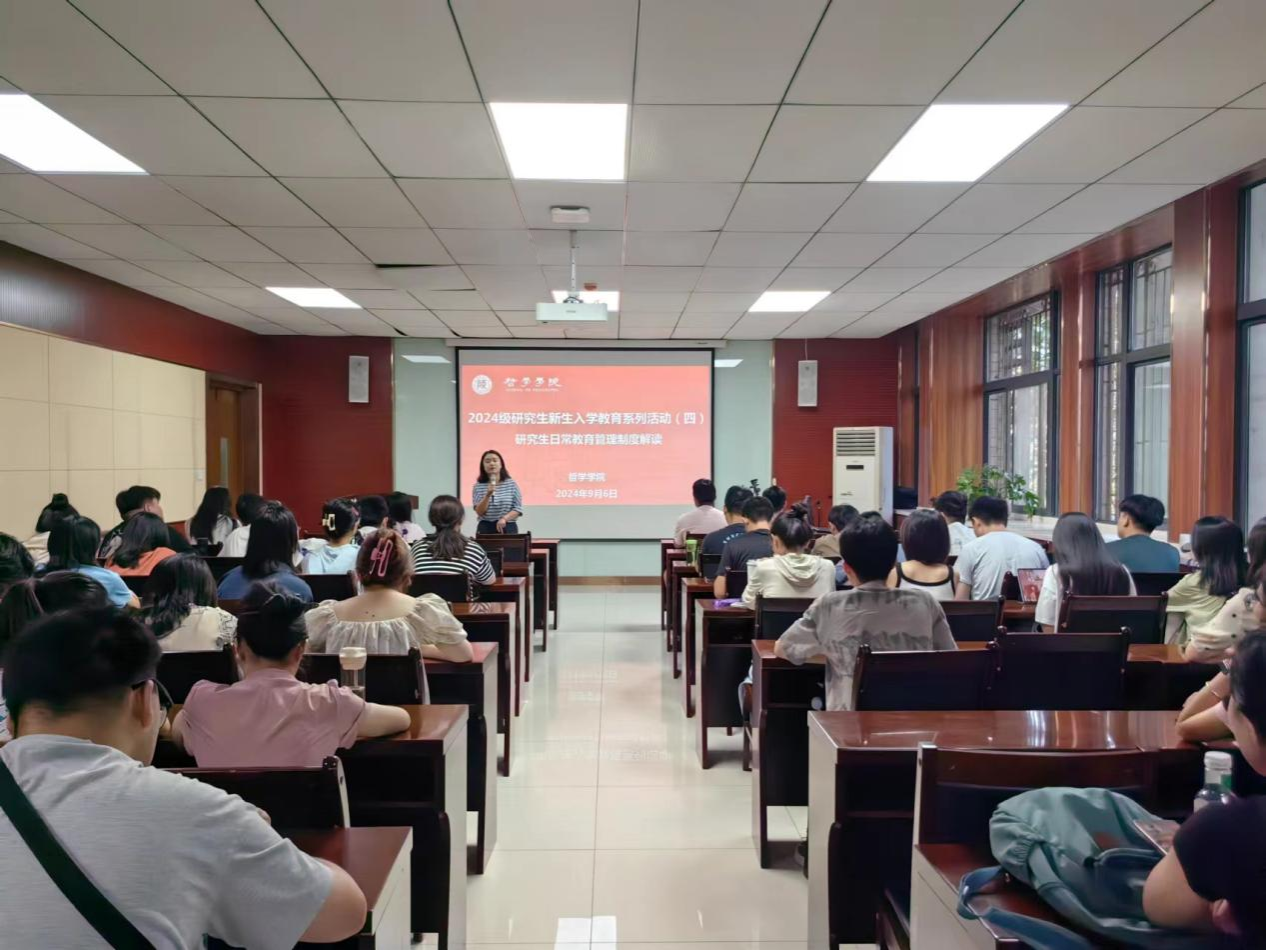 为帮助2024级研究生新生更好适应学习生活,9月6日上午,学院在文澜楼三段3222会议室召开研究生新生入学教育系列活动第四场专题讲座,由研究生辅导员张凡为同学们解读学校学院研究生日常管理及奖助学金相关制度文件,学院全体研究生新生参加了活动。