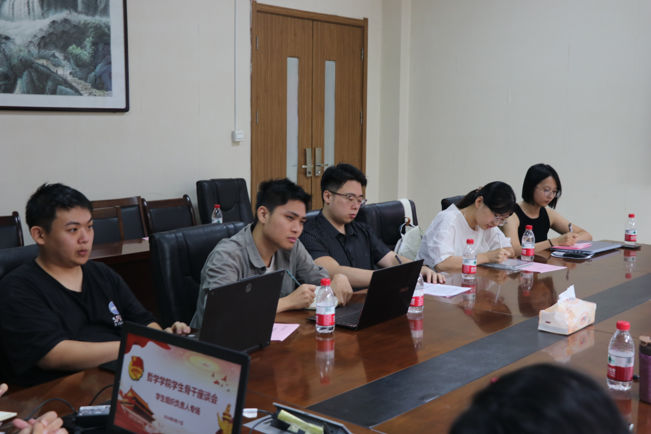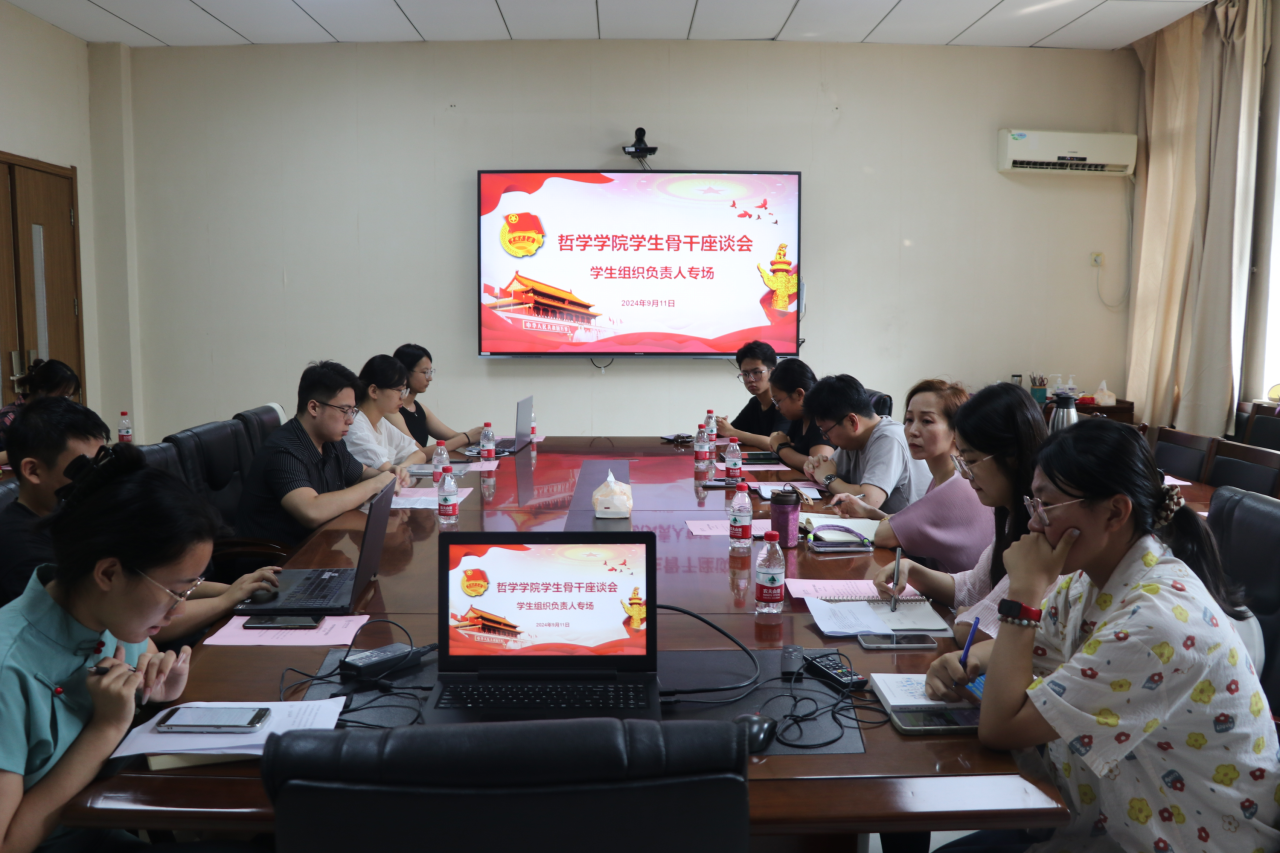 9月11日下午,在学院一层会议室进行了座谈会学生组织负责人专场,学院党委副书记、纪委书记李晔,团委书记张哲,学院团委、学生会、研究生会、新闻中心、弈林棋友社、思苇哲学社,哲学书院古希腊文化研习社、耕读研习社、关中文化研习社等学生组织负责人及负责人后备人选参加会议。会议由张哲主持。