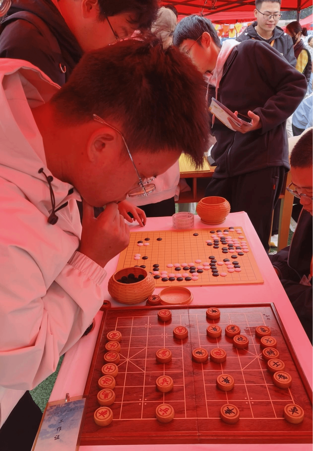长安三万里,不过是棋盘的天下。活动现场我们设置了围棋、中国象棋、国际象棋、五子棋等多种棋类。参与同学或是两两组合自由对弈,或是与弈林棋友社工作人员现场邀约厮杀,或是多人一心共同体验棋类乐趣……在这场棋盘上的盛宴中,每一步棋都如同战场上的精心布局,棋子间的每一次交锋都迸发出智慧的火花。这场智力的较量让人为之着迷,惊叹于其深邃与精彩。选手们时而凝神静思,沉浸在自己构建的思维迷宫中;时而目光如炬,锐利地洞察对手的每一个微小动作。