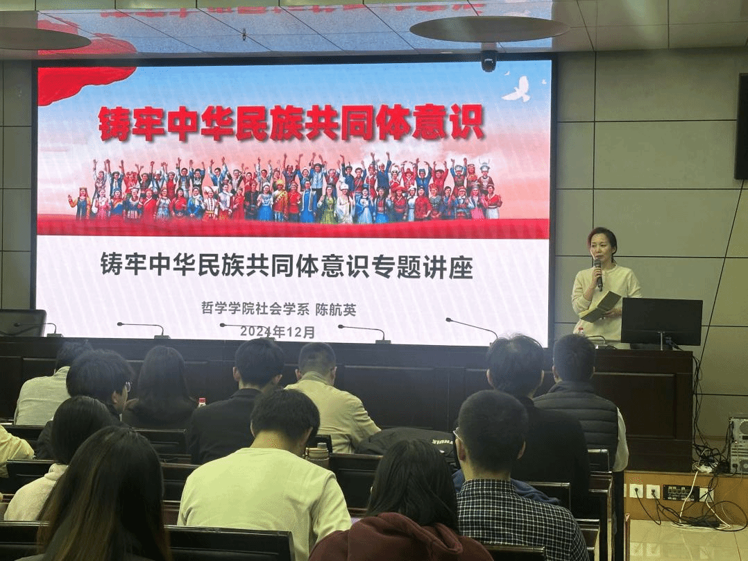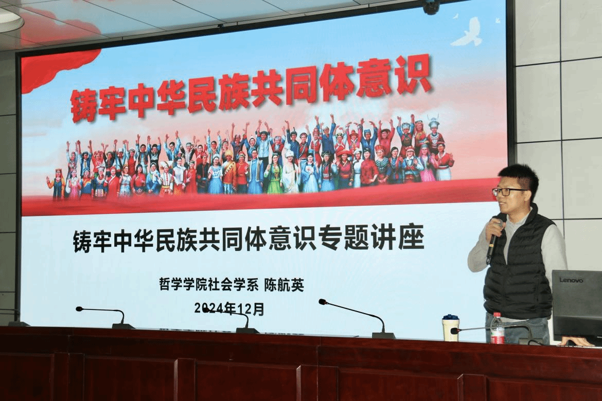 他强调,坚持以铸牢中华民族共同体意识为主线,是我们树立正确中华民族史观、适应严峻复杂形势、不断改进民族工作的根本指导和基本遵循。最后,陈航英鼓励同学们在日常学习生活中,要多看书、乐实践、擅调研、勤创作,自觉做铸牢中华民族共同体意识的坚定拥护者、有力宣传者和忠实践行者。讲座史料详实、内容丰富、案例生动、气氛热烈,有效引导全体师生进一步深化对铸牢中华民族共同体意识重大意义的理解。