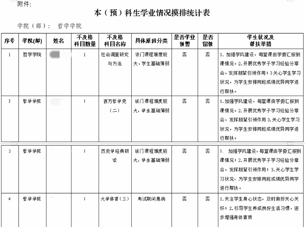 3.常态化开展学业摸排和点对点帮扶。根据学分清查情况,党委副书记、辅导员与存在不及格科目的学生逐一谈话,帮助学生分析学业困难的原因,共同提出解决问题的举措。在低年级本科中开展“阵地化辅导、门诊式作业”活动,安排成绩优异学生点对点帮扶学业困难学生,切实帮助学生解决学习问题,提高学习效率。