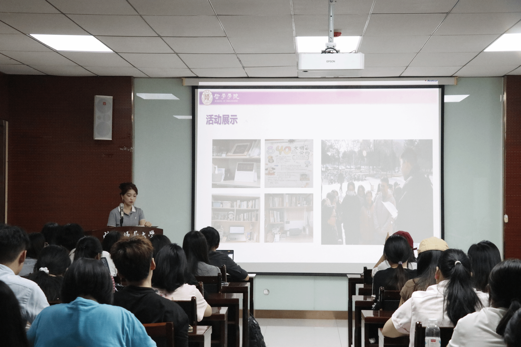 宣讲尾声,王思淇再次强调各部门 “分工明确、互帮互助” 的协作优势,她鼓励新生以研会为纽带,结合兴趣特长参与服务,在传承哲院精神中锤炼能力,在凝聚学生力量中实现成长,共同为学院发展注入青春动能。