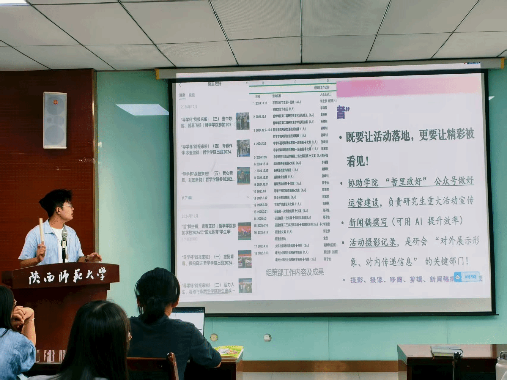 宋孟林围绕 “思想引领与成长赋能”,介绍负责部门的精神传递:组织策划部以传播核心价值观、弘扬哲院学风为核心,通过新闻宣传、协助 “哲里政好” 工作室运营新媒体,宣传先进典型,更牵头建立全新活动策划制度,让学生需求成为活动设计的核心,体现民主参与;学术科技部深耕学术氛围营造,以讲座推送、论坛组织、考博经验分享助力学业成长;就业发展部搭建就业服务平台,对接企业、建立信息共享群、搜集申博信息,全方位为学生发展赋能,凝聚成长合力。