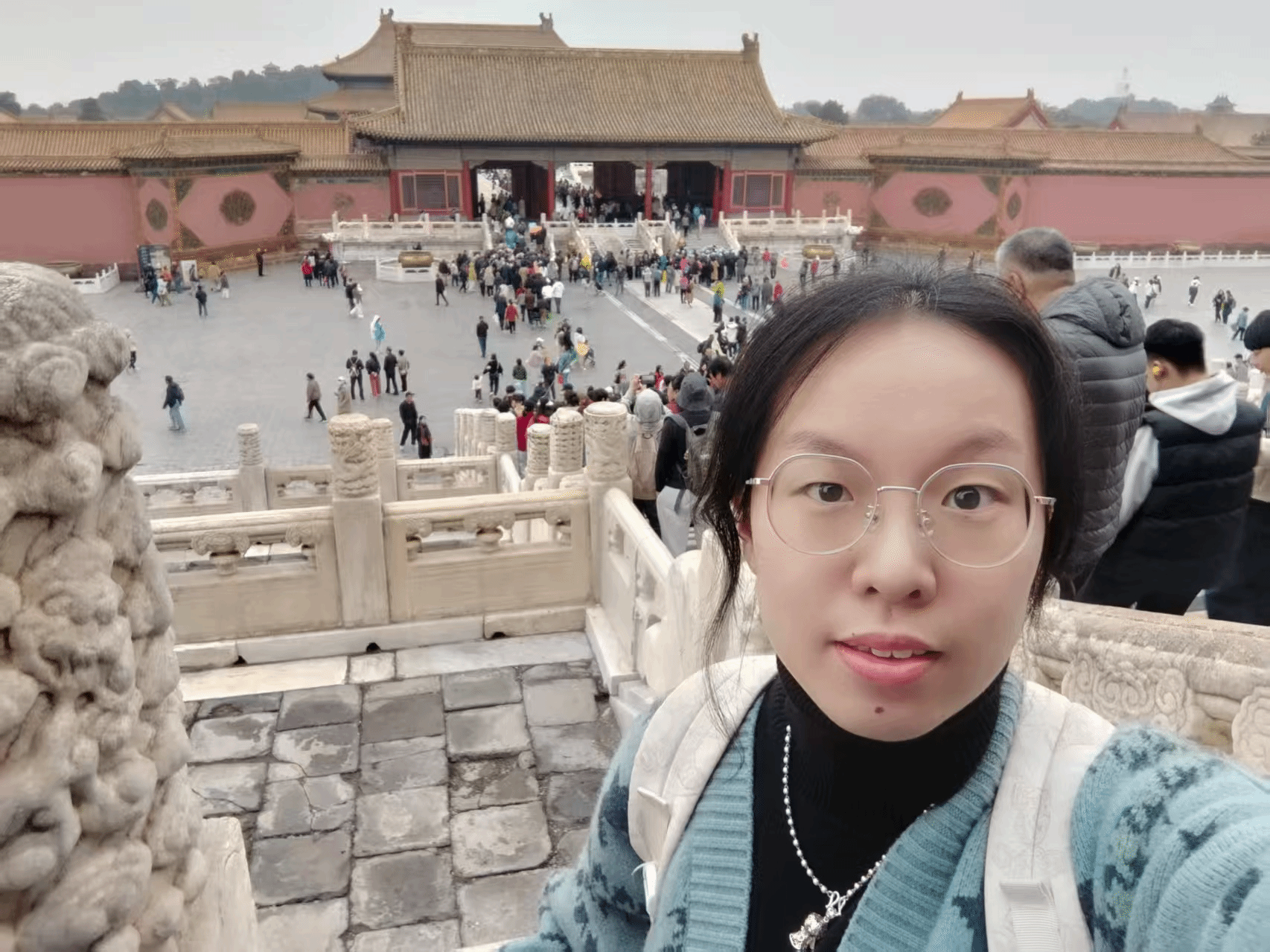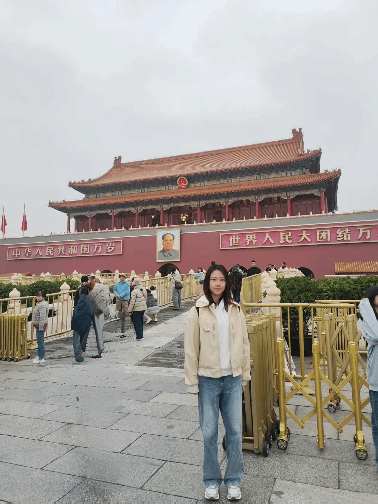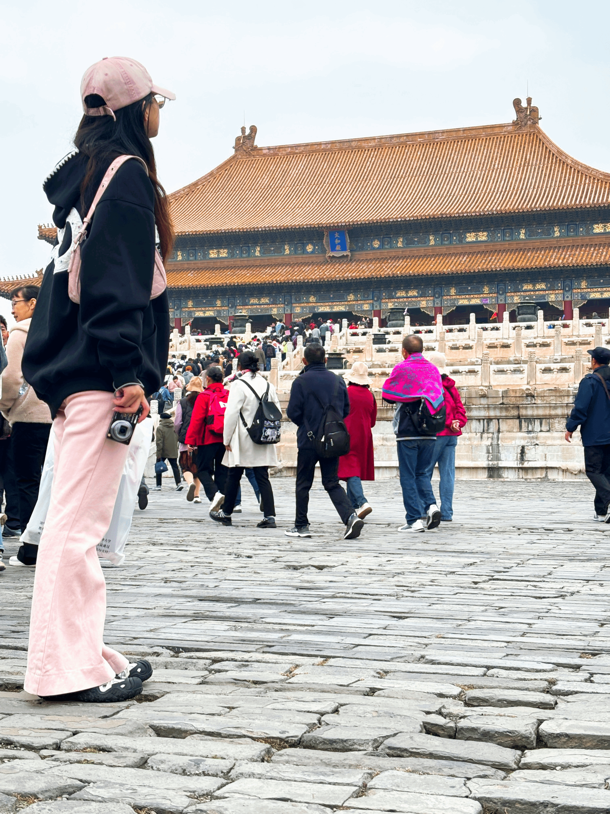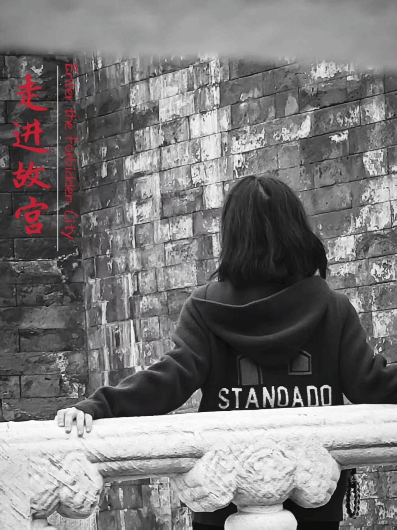 在太和殿广阔的广场上,南奕行请身边的同学拍下了一个仰望的身影——巨大的宫殿与渺小的个体,构成强烈视觉对比。“走过一道道宫门,我的身影被夕阳拉长在石板上。那一刻,我不再只是参观者,而是成为了紫禁城故事里一个流动的注脚。”