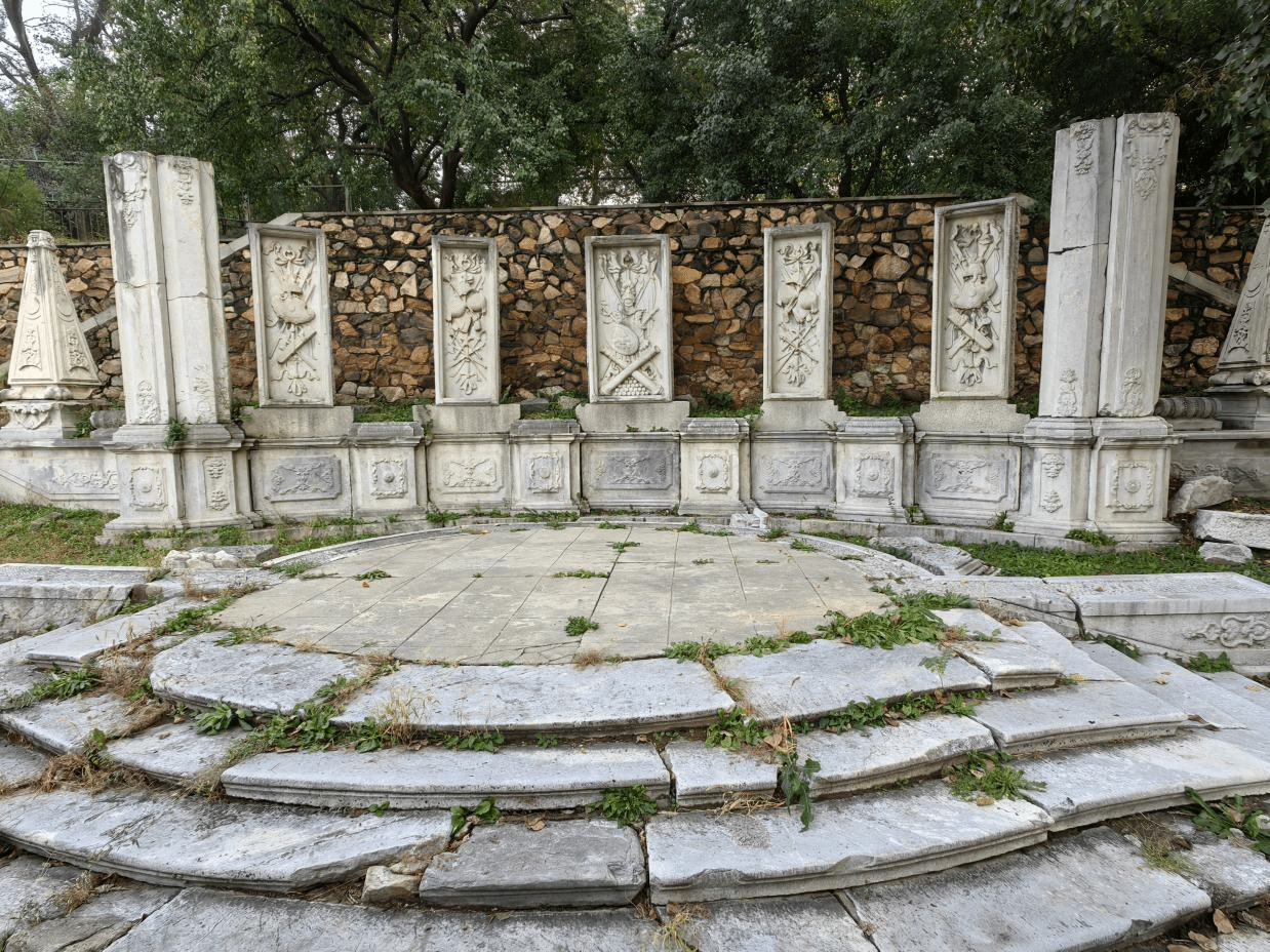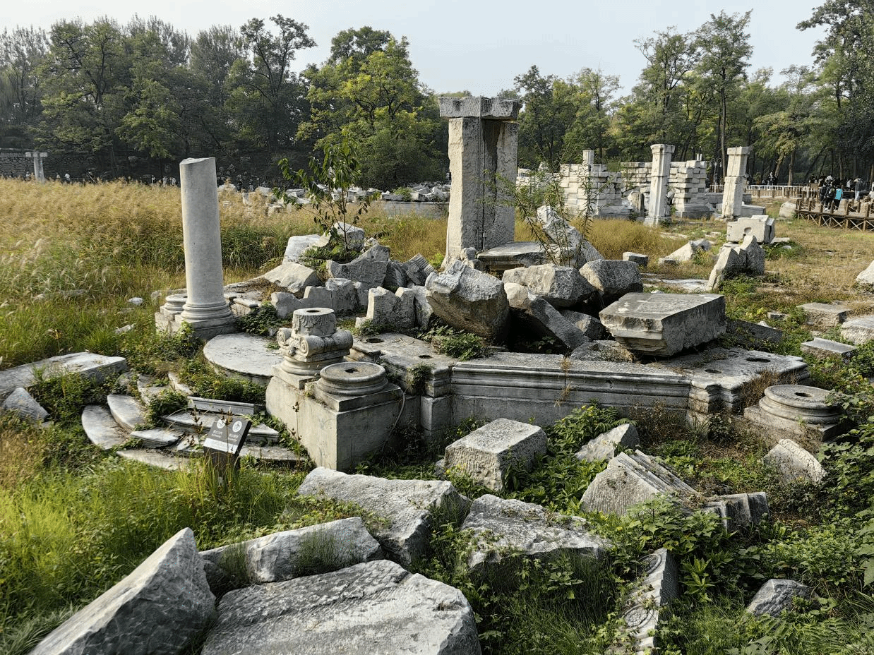 午后,师生一行转赴圆明园。清冷的北京秋阳洒在大水法的断壁残垣上,汉白玉石柱上的卷草纹已被岁月磨平,基座的灼痕却依旧清晰——那是1860年烈火留下的民族伤痕。观水法石台前,栏杆不存,仅余基孔;中央御座的位置青苔斑驳,与散落的石构件一同静默诉说,不少同学感叹道:“这里的每一块石头,都是一页没有装订的史书。”
