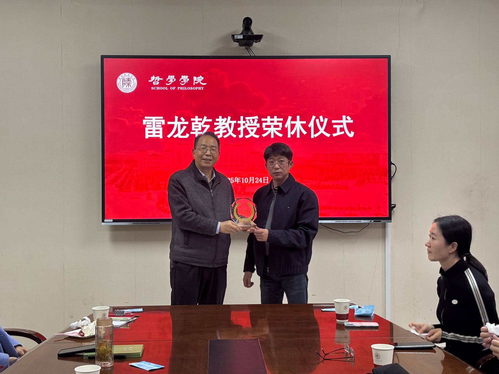 仪式最后,学院向雷龙乾教授赠送纪念品,全体人员合影留念。此次荣休仪式既致敬了雷教授的四十年教坛坚守,也彰显了学院尊师重教的人文底蕴,让“学术共同体、生命共同体”的理念更加深入人心。