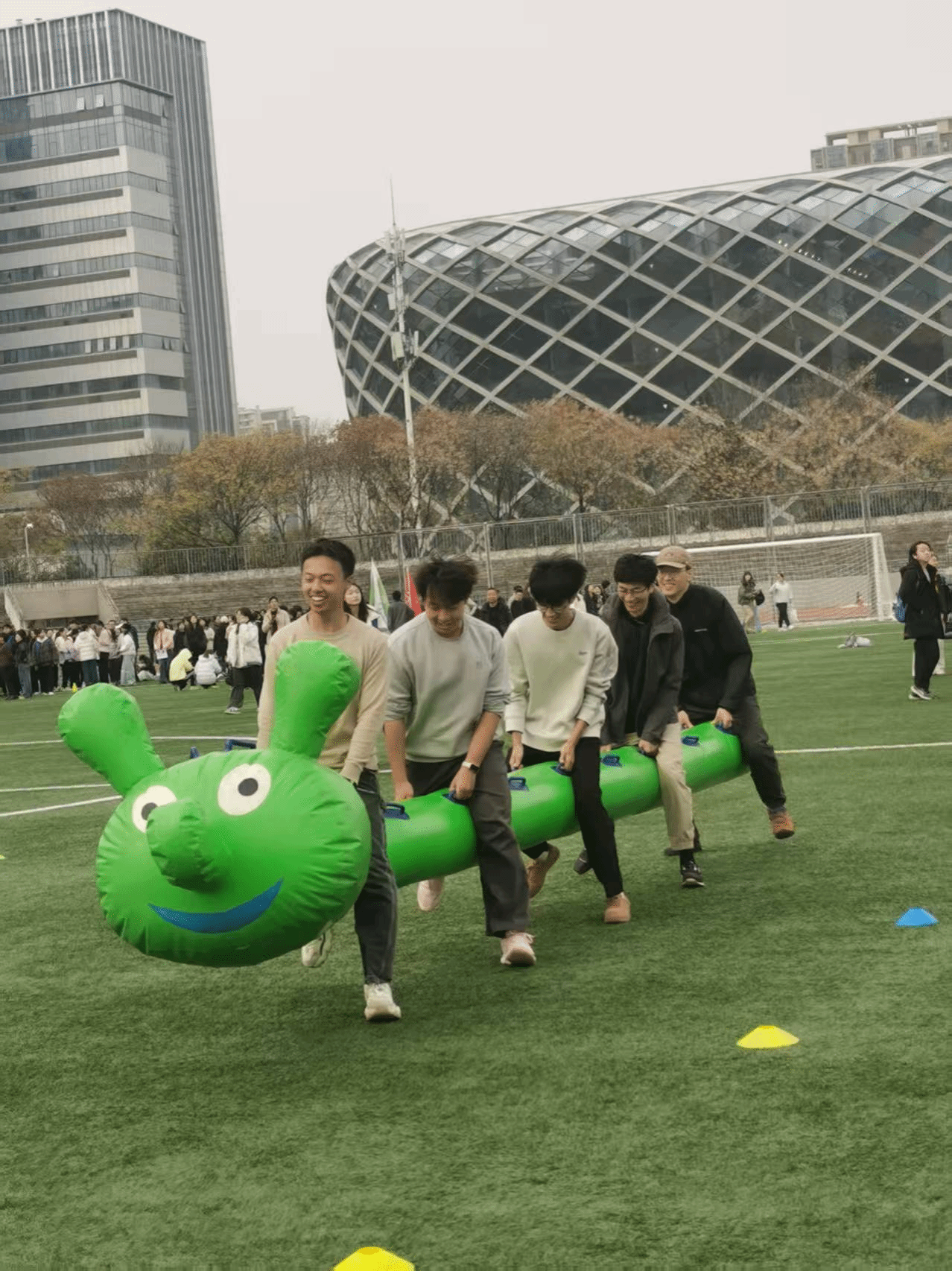 “各就各位——”参赛成员齐刷刷跨上彩色“毛毛虫”,双手紧握提手。哨声一响,“一二一”的口号此起彼伏,大家骑着“巨虫”冲向终点,笑声洒满跑道。